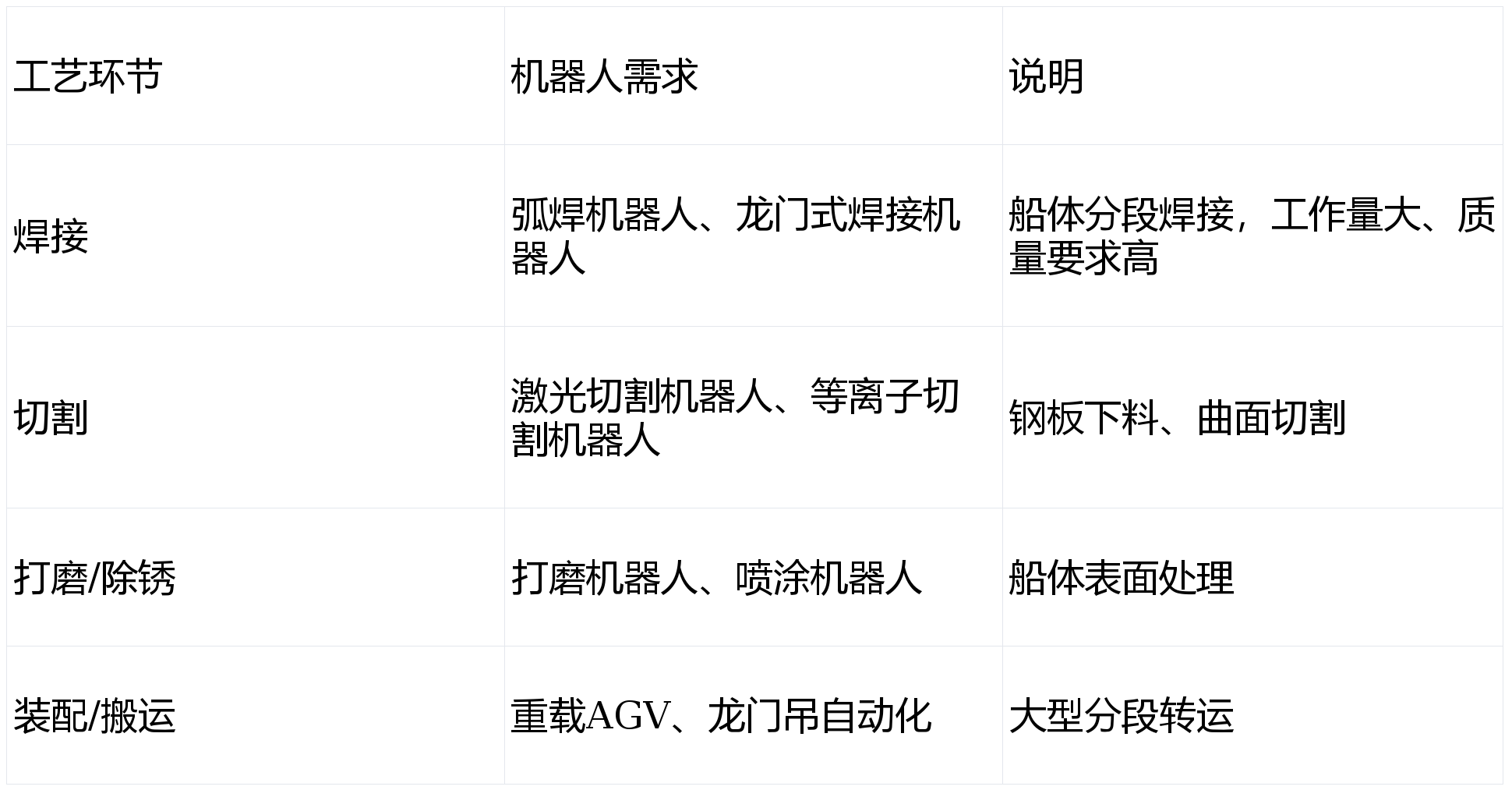 造船是典型的“重工工藝”,對(duì)機(jī)器人的需求集中在幾個(gè)核心環(huán)節(jié):