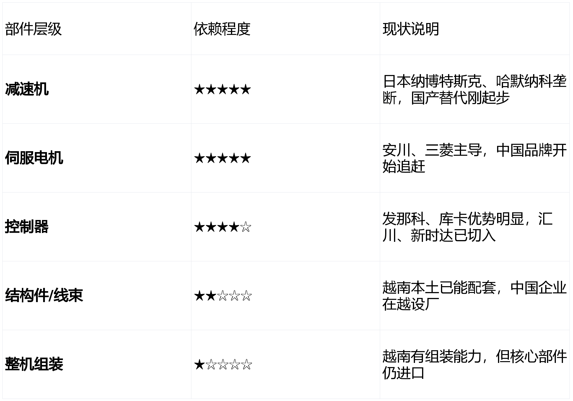 ??前面我們聊了越南機(jī)器人市場的宏觀環(huán)境、競爭格局、本土化挑戰(zhàn)和戰(zhàn)略建議。今天來挖一個核心問題:核心部件還在中國造,在越南組裝——這種模式能持續(xù)多久?